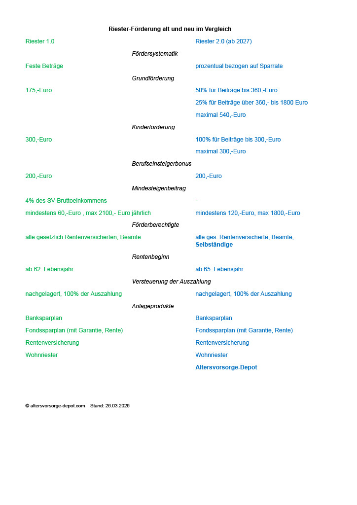 Der Bundestag hat heute die lange erwartete die Riester-Reform verabschiedet. Dabei ändert sich die Fördersystematik von festen Beträgen zu einer prozentualen Förderung. Eigenbeiträge werden künftig mit bis zu 540,-Euro gefördert, die Kinderförderung bleibt bei 300,-Euro. Das Renteneintrittsalter steigt von 62 auf 65 Jahre. Künftig werden auch Selbständige förderberechtigt sein. Neu wird ein Altersvorsorgedepot eingeführt, das im Gegensatz zum bisherigen Fonds-Riester ohne teure Kapitalgarantie und ohne Verrentungspflicht auskommt und damit vor allem Jüngere mit einem langen Anlagehorizont anspricht.
